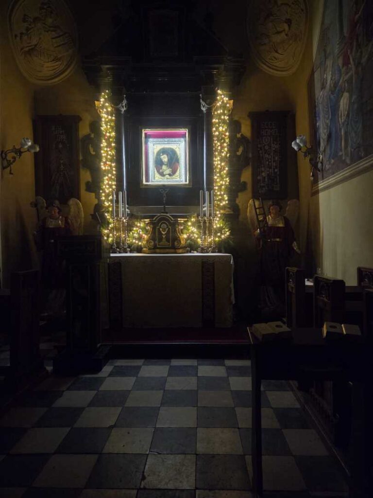 Do Klasztoru w Alwerni wybrałam się, aby obejrzeć jedną z najpiękniejszych ruchomych szopek w Małopolsce. Słyszałam, że jest naprawdę duża i zawiera aż 40 ruchomych figur sprowadzonych z Neapolu, światowej stolicy szopek. Niestety, mimo tego, iż klasztor był otwarty, nie było mi dane podziwiać tę szopkę. Światła były zgaszone a szopka wyłączona i nieczynna. Poniżej wstawiam zdjęcia, które udało mi się zrobić.