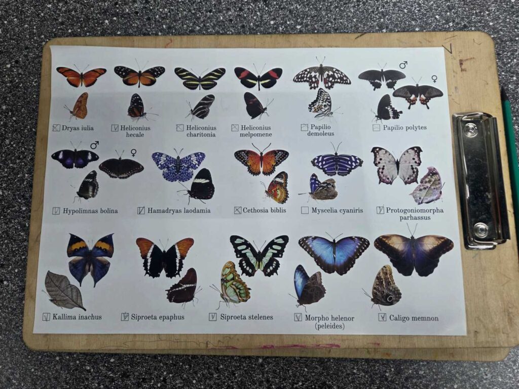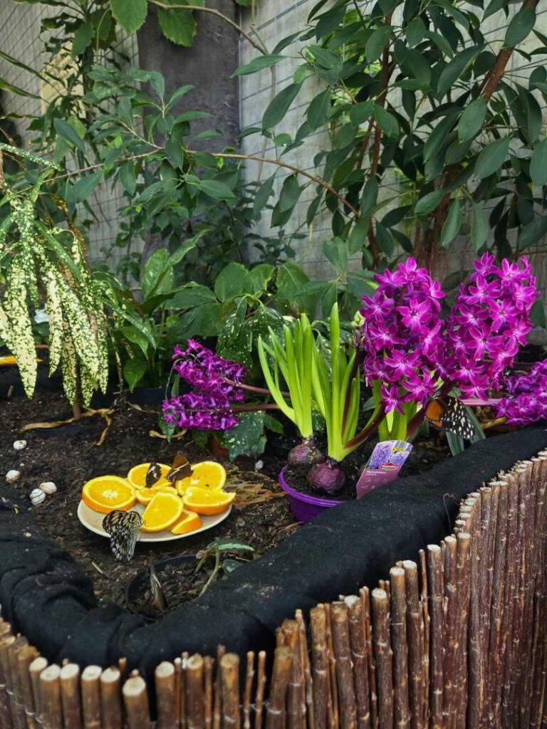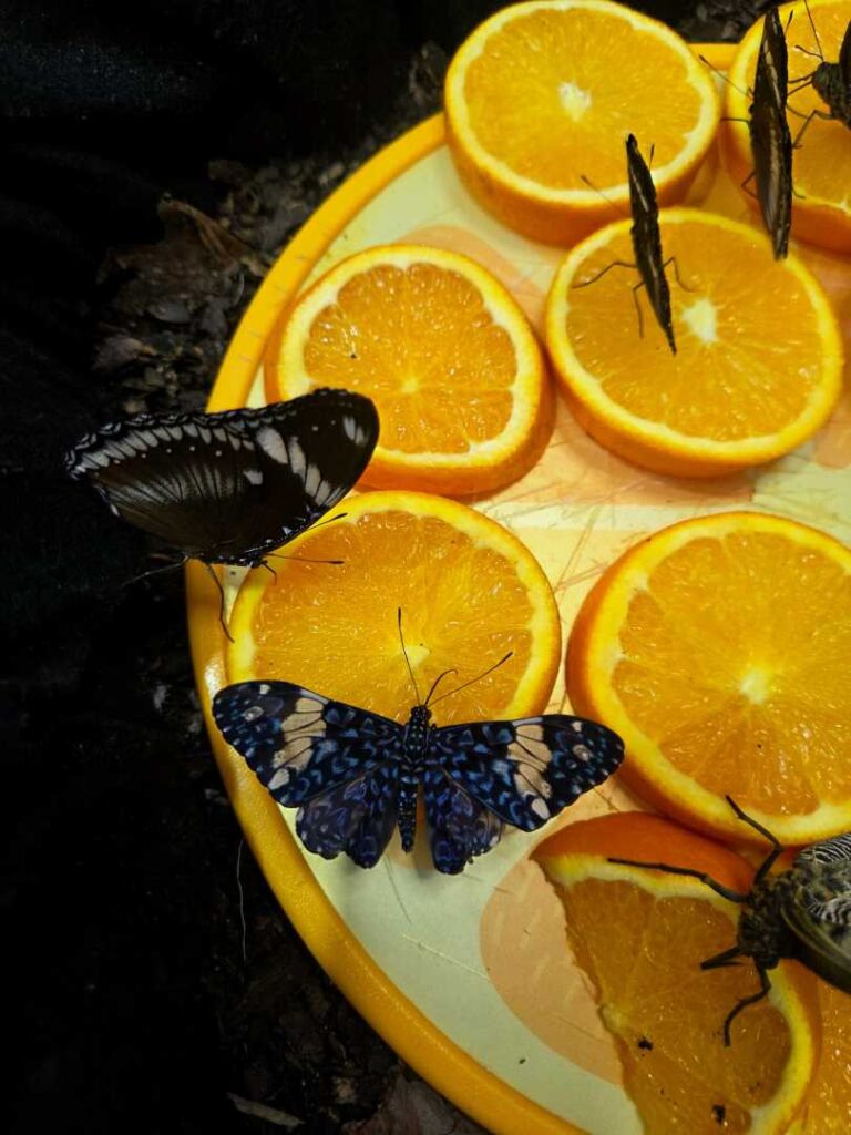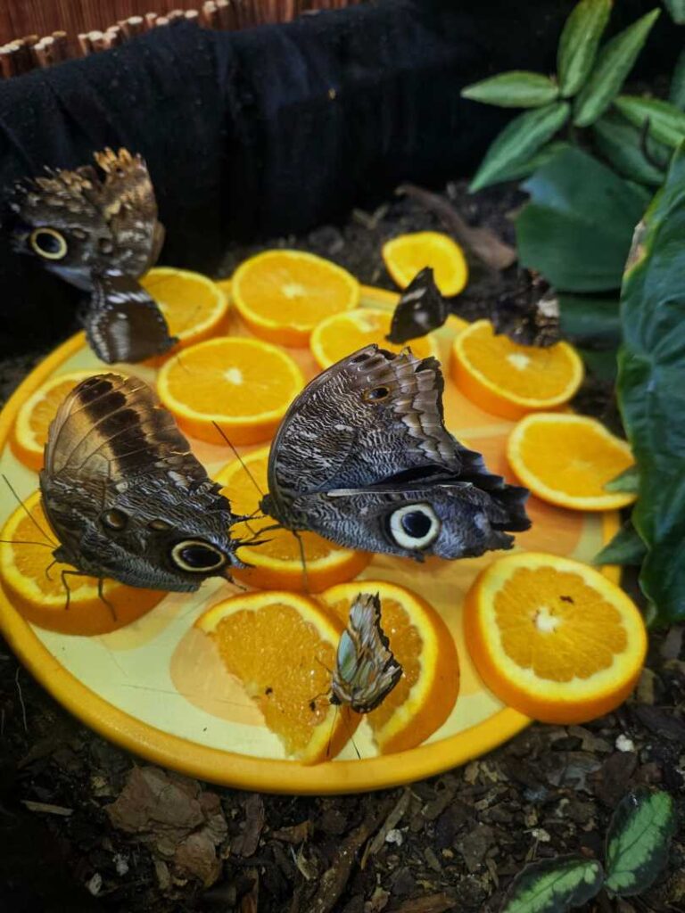 Trzecim etapem zwiedzania motylarni jest już oglądanie żywych motyli. Uzbrojeni w wiedzę i wyposażeni w kartki, na których mogliśmy zaznaczać motyle, które zobaczymy i rozpoznamy, wkroczyliśmy do motylego świata. W pomieszczeniu było ciepło i wilgotno. Prawdziwe tropikalne środowisko, pełne zieleni i różnych roślin stanowiących schronienie i pokarm dla motyli. A w pomieszczeniu znajdowało się ich około stu. Część latała wokół nas, część siedziała na olbrzymim oknie lub na plastrach pomarańczy. Bardzo ważne jest, aby przemieszczać się powoli, gdyż można takiego osobnika przydeptać. Zaraz obok drzwi wejściowych znajduje się „inkubator”, w którym przebywają kokony, a z nich za niedługo będą kolejne motyle. Oprowadzanie po Motylarni odbywa się w małych grupach po kilkanaście osób i trwa około godziny. Warto pamiętać, żeby rezerwację zrobić z wyprzedzeniem, aby mieć pewność, że zobaczymy na pewno te kolorowe motyle.
