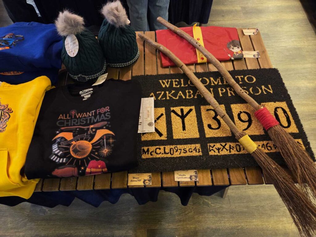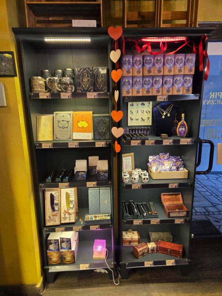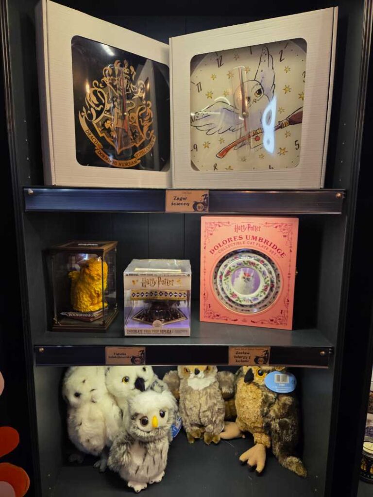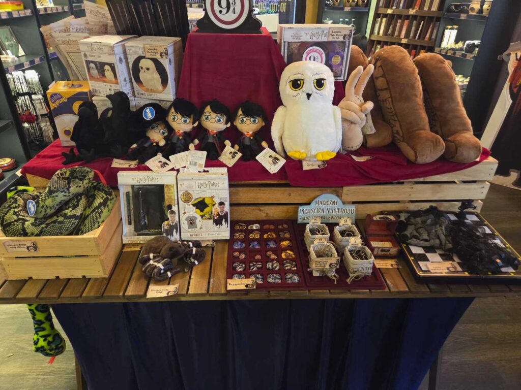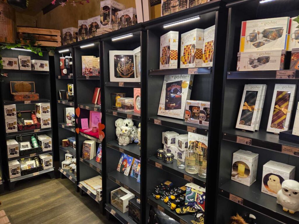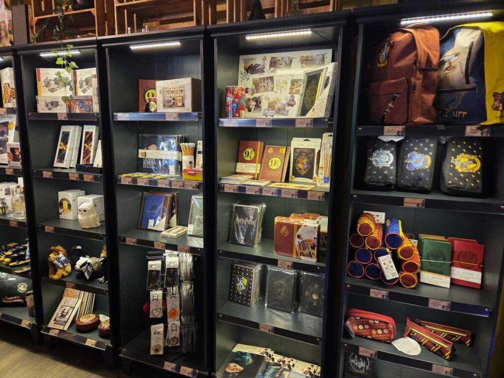 W asortymencie Magicznego Sklepiku znajdują się wyłącznie licencjonowane przez Warner Bros gadżety. Są to różdżki, ubrania, plecaki, gry planszowe i puzzle, zeszyty i artykuły szkolne, kosmetyki i akcesoria do makijażu, kubki i figurki, biżuteria, słodycze i oczywiście książki Harry Potter.