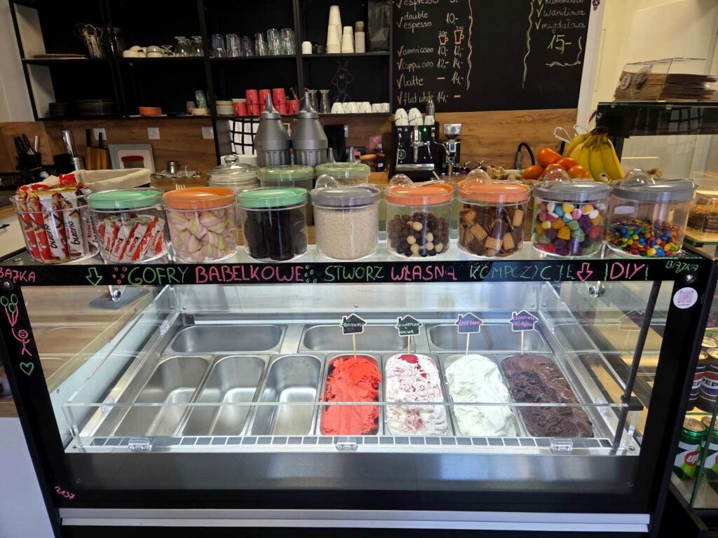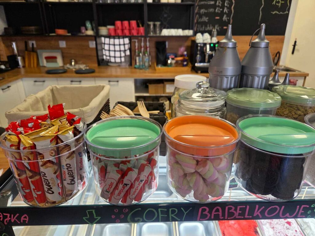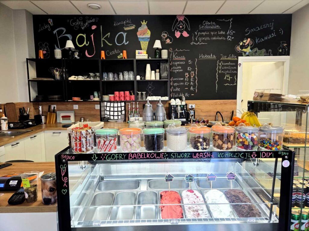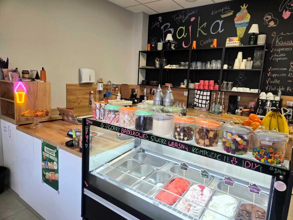 Jak już wspomniałam „Bajka” znajduje się w Wadowicach, na Placu Kościuszki, w niedalekiej odległości od szpitala, więc nie trudno ją znaleźć. To naprawdę fantastyczne miejsce z rewelacyjną obsługą. Pan sprzedający i zarazem właściciel jest bardzo miły, uśmiechnięty i widać, że kocha to co robi. Lody pyszne, naturalne. Ciasta świeże, własnoręcznie pieczone przez właściciela. A gofry bąbelkowe – to mistrzostwo. Najfajniejsze jest to, że mogłam sama zaprojektować swojego gofra korzystając bez ograniczeń z dostępnych owoców, słodyczy, pianek, sosów i posypek. Na pewno jeszcze tu wrócę i Was też zachęcam do odwiedzenia Bajki i zrobienia własnego gofra. Naprawdę warto!