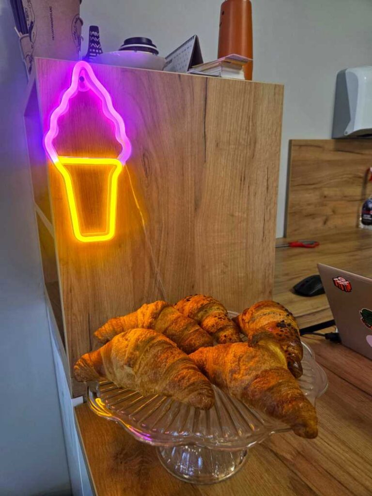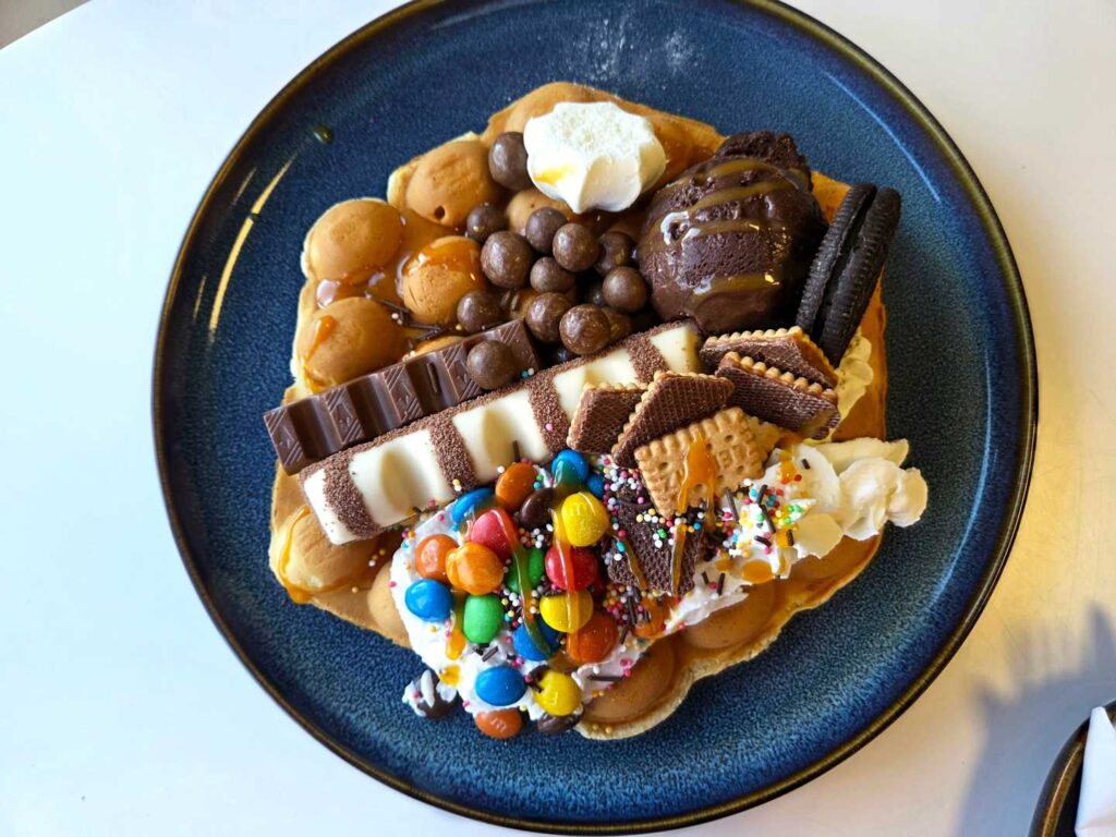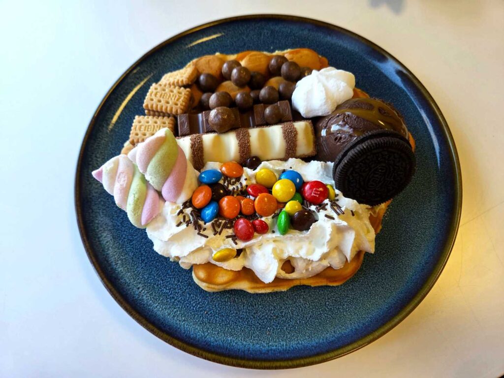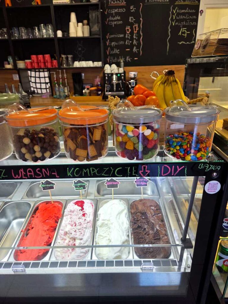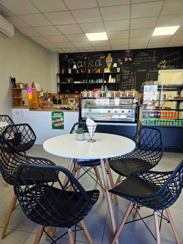 Jak już wspomniałam „Bajka” znajduje się w Wadowicach, na Placu Kościuszki, w niedalekiej odległości od szpitala, więc nie trudno ją znaleźć. To naprawdę fantastyczne miejsce z rewelacyjną obsługą. Pan sprzedający i zarazem właściciel jest bardzo miły, uśmiechnięty i widać, że kocha to co robi. Lody pyszne, naturalne. Ciasta świeże, własnoręcznie pieczone przez właściciela. A gofry bąbelkowe – to mistrzostwo. Najfajniejsze jest to, że mogłam sama zaprojektować swojego gofra korzystając bez ograniczeń z dostępnych owoców, słodyczy, pianek, sosów i posypek. Na pewno jeszcze tu wrócę i Was też zachęcam do odwiedzenia Bajki i zrobienia własnego gofra. Naprawdę warto!